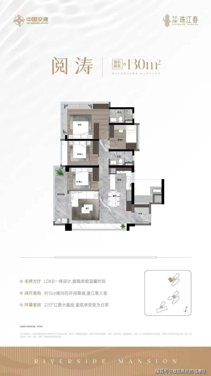 :三开间朝南,主卧套房设计,搭配全景落地窗,尽享630米宽江景;