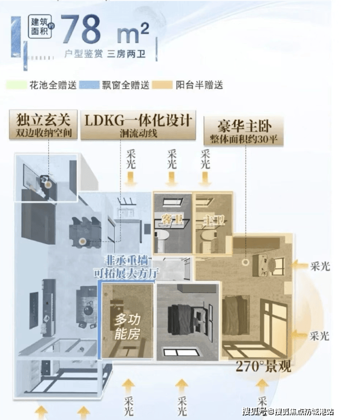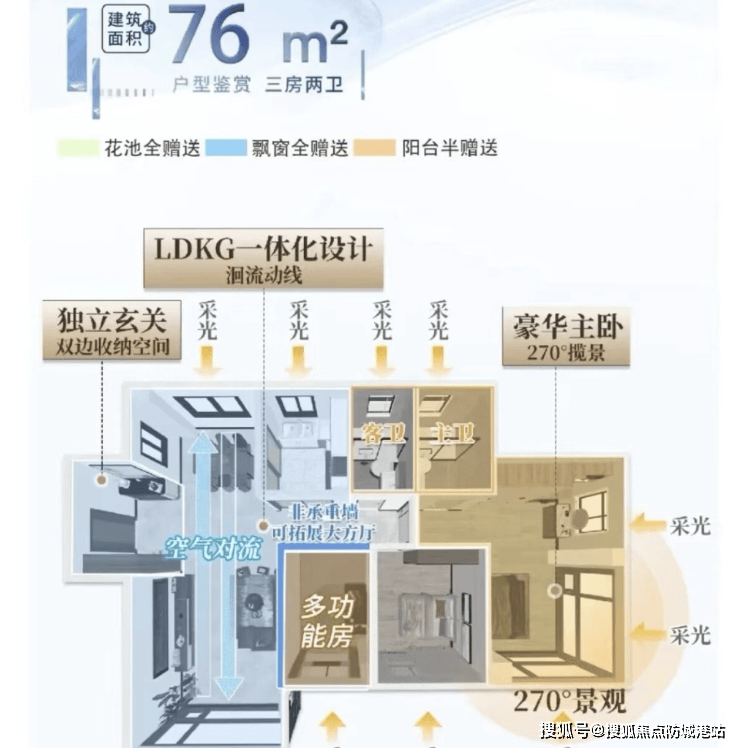 76㎡三房两卫:LDKG一体化布局,主卧配270°环幕窗,独立玄关提升收纳,最小面积实现三房功能。