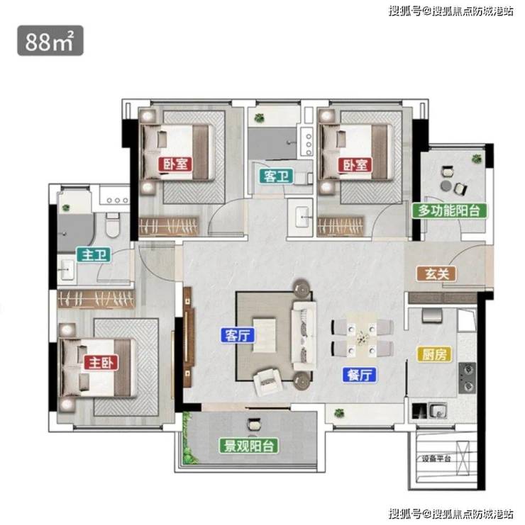 88平横厅布局是我最喜欢的一个户型,麻雀虽小五脏俱全,南北对流,布局合理。