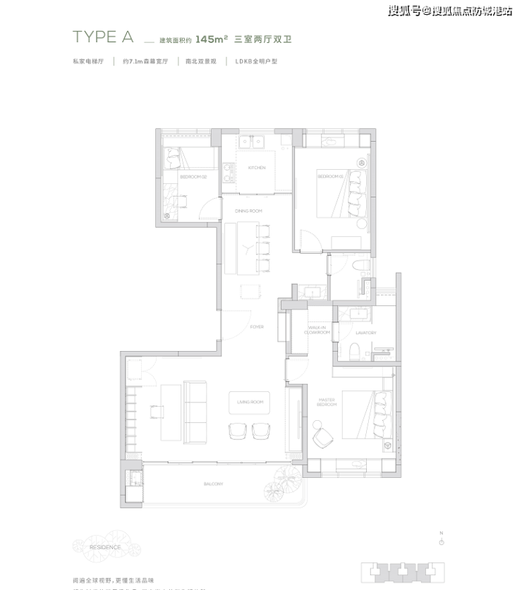 145产品为三房两厅两卫产品,餐厨一体化设计, 7米宽厅可切换各种生活场景,畅享宽幕般景观界面。