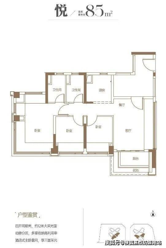 保利珠江印象采用“全南向+大面宽”设计,主力户型实现85%以上得房率: