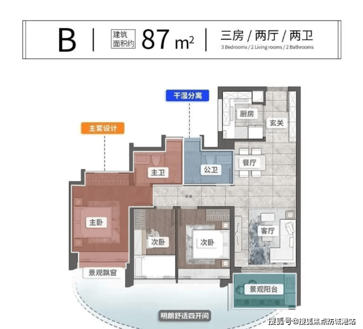 87㎡三房两厅两卫:双卫设计解决早晚高峰使用冲突,餐客一体连通阳台,采光通风俱佳,总价约296万元起,市场热门户型;