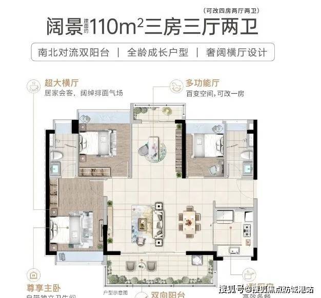 125㎡四房:南北通透双景设计,总价360-380万,主卧带独立卫浴。