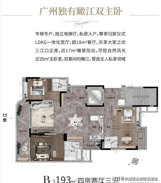 兰园江悦位于广州市荔湾区白鹅潭CBD,紧邻珠江,拥有得天独厚的一线江景资源。该项目是兰园在广州中心区首次拿地开发的成果,占地面积约1.4万㎡,建筑面积约2.7万㎡,容积率≤2.68,绿地率达到了40%。项目主打193㎡和285㎡的大平层户型,仅规划了一栋楼,共68套住宅,旨在为高端客户提供极致的居住体验。