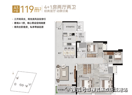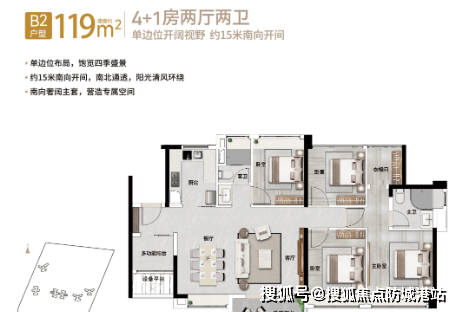 119㎡4+1房2厅2卫:单边位布局,15米南向开间,南北通透,适合改善型购房者。