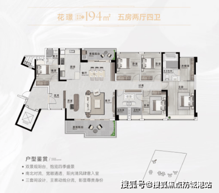 194㎡五房2厅4卫(三套房):南北对流双景观阳台,观景与生活两不误,奢华主套配备衣帽间。