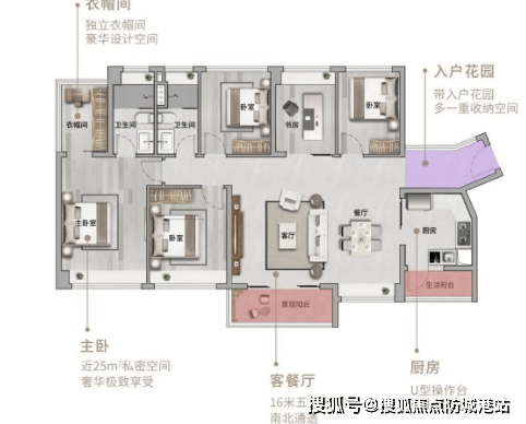 140㎡5房2厅2卫:南北对流,约32平方米阔绰客餐厅,约16米南向五开间,豪华主卧带独立衣帽间。