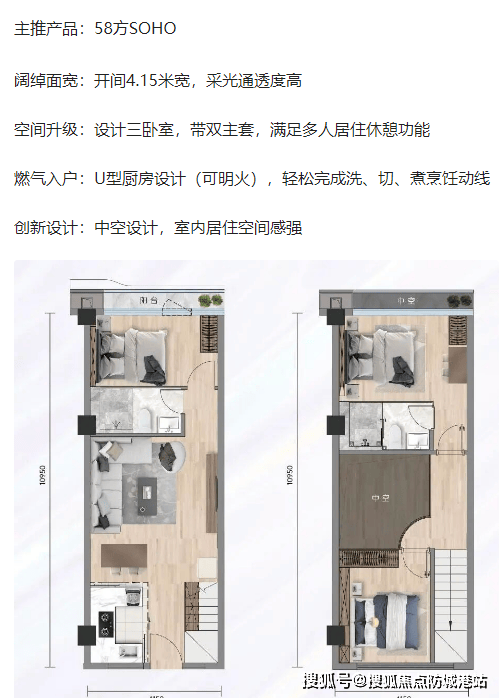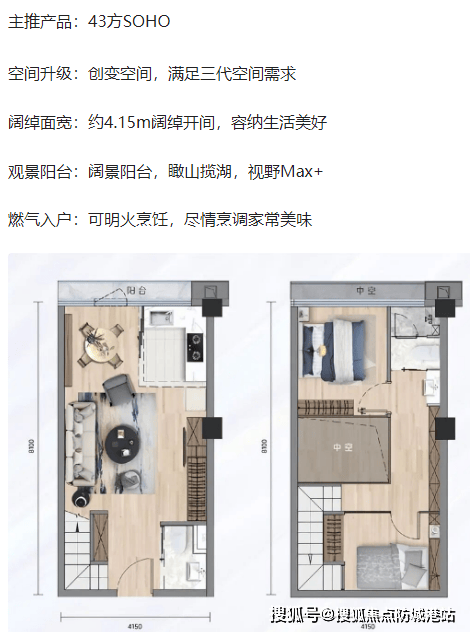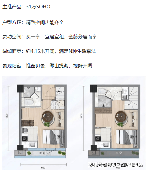 项目主打建面约 31-58㎡复式公寓,均以 “4.5 米层高 + 高使用率” 为设计核心,使用率超 180%,且部分户型可明火带阳台,在天河公寓中极为稀缺。以建面约 31㎡SOHO 复式为例,采用 “买一层用两层” 设计,一层规划客厅、厨房、阳台,客厅面宽达 4.15 米,连接约 3㎡景观阳台,可瞰山揽湖;二层打造独立卧室与书房,空间利用率极高,适配单身刚需或投资客,月租金预计达 4000 元。建面约 43㎡SOHO 复式则升级为 “三房布局”,一层设客厅、厨房、卫生间与阳台(可明火),二层规划两个卧室与储物间,满足三口之家居住需求,且 4.15 米阔绰开间保障采光与通风。建面约 58㎡SOHO 复式为 “三卧室双主套” 设计,一层设 U 型厨房(可明火)、客厅、阳台与长辈房,二层打造两个主卧套房,配备独立卫浴与步入式衣帽间,中空设计增强空间感,适配多代同堂或高端租赁需求,投资回报率高达 7%。