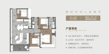 105㎡四房两厅两卫:空间宽敞,满足多代同堂的家庭需求。