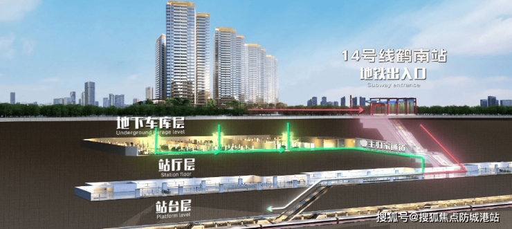 公共交通:项目与14号线鹤南站A出口联通,直达社区地下二层车库的大堂,实现无缝接驳,不受天气影响,归家更加便捷。