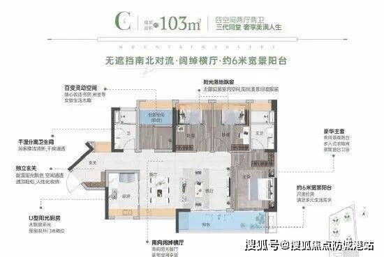 103平方米户型:南北通透,四房带主套设计,配备超6米宽MAX宽景阳台,独立入户玄关,使用率约94%。