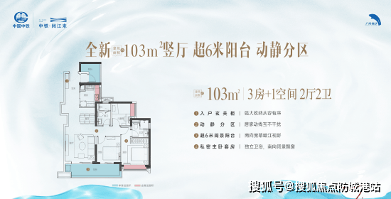 全新103㎡横厅户型:进一步优化了空间布局,采用超6米阔景阳台设计,做到动静分区,特别是私密主卧套房的设计,提升了居住舒适度。