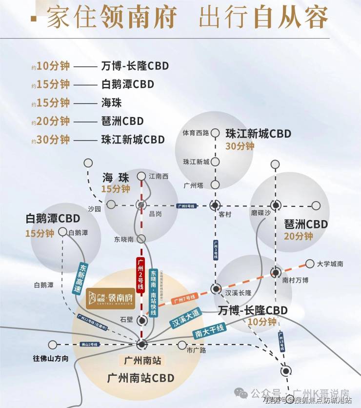 交通脉络决定居住便捷度与物业价值高度,广州城投·岭南府构建“双地铁+主干道+高快速路+枢纽”四维立体交通网络,依托南站枢纽能级,实现湾区核心城市高效畅行,执掌城芯出行速度。轨道交通层面,项目距2/7号线石壁站步行仅约300米,双地铁无缝衔接,7号线1站直达广州足球公园、3站抵达长隆欢乐世界、4站直达万博商圈,畅达万长南黄金走廊;2号线快速串联广州南站、海珠、白云等核心区域,换乘便捷,半小时内直达珠江新城、琶洲等主城核心板块,高效通勤无需久候。道路交通层面,项目紧邻汉溪大道、南大干线等城市主干道路网,形成四横四纵便捷路网格局,自驾可高效通达万博CBD、珠江新城、琶洲商务区、广州南站等核心板块,通勤出行高效便捷;同时衔接华南快速、新光快速、东新高速等高速路网,无缝通达佛山、东莞、深圳等湾区城市,跨城出行畅通无阻。枢纽联动层面,项目毗邻广州南站,汇聚高铁、城际、地铁、客运等多元交通方式,通过22号线、广佛环线、海珠湾隧道等多维交通,快速直达珠金琶、白鹅潭、海珠等核心区域,湾区一小时生活圈轻松实现,无论是日常通勤、商务出行还是休闲出游,均能尽享畅通无阻的出行体验,完美契合城央改善家庭的出行需求。