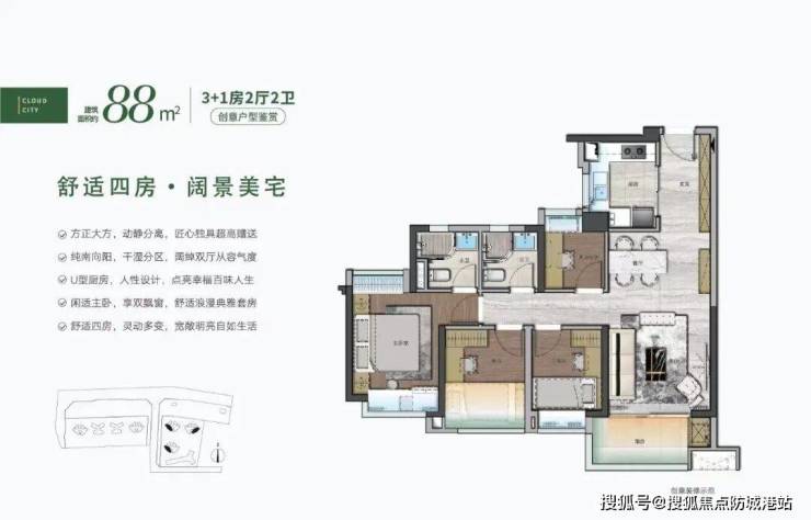 88㎡:四房户型,布局合理,空间利用高效。