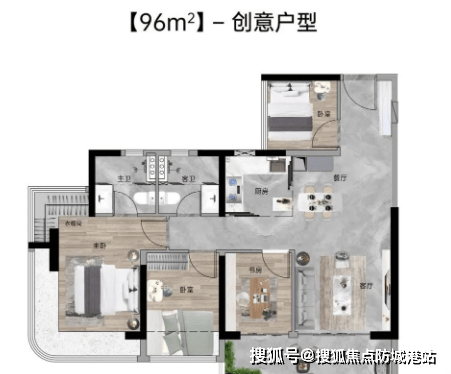 96㎡四房两厅两卫:西南朝向,使用率为100%,带有约5.7米面宽瞰山阳台,主卧设有270°弧形玻璃幕窗。