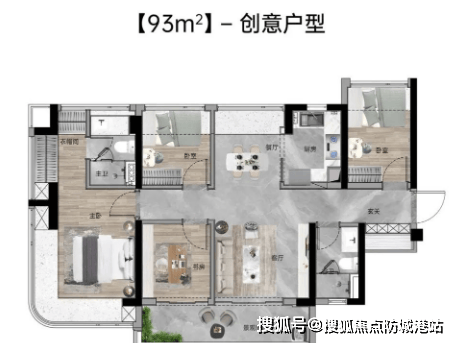 93㎡四房两厅两卫:东南朝向,使用率高达109%,独立入户玄关,南北通透,四面宽极致视野,主卧同样采用270°弧形玻璃幕窗。