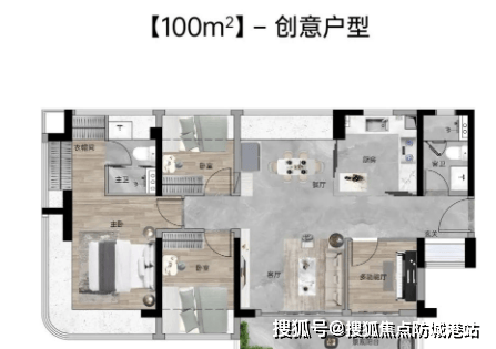 100㎡四房两厅两卫:西南朝向,使用率达109%,南北通透,配有约6.1米巨幕阳台,主卧同样配置270°弧形玻璃幕窗。