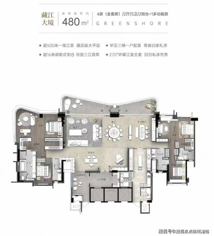 项目提供多样化的户型选择,涵盖140-480平方米的江景大平层、叠墅等。其中,四房双主套的洋房户型面积在140至270平方米之间,而叠墅则分为两叠和三叠产品,面积从279到437平方米不等,实用率高达355%。部分户型首层花园面积达797平方米,配备了私家电梯、入户花园及超大露台,充分满足不同家庭的需求。