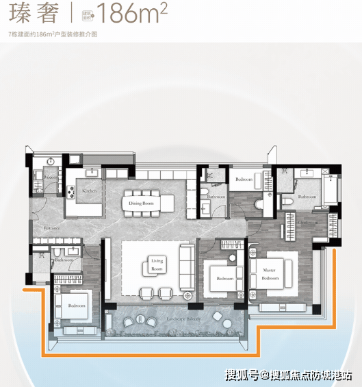 项目主力户型为建面约 110-180㎡南向滨水三四房,梯户比 3 梯 4 户或 3 梯 5 户,部分户型使用率超 100%。110㎡户型可改四房,全开间朝南,享 11.3 米南向采光面,LDK 客餐厨一体化设计,空间灵动;125㎡户型全明 4 开间朝南,12.8 米大面宽,IMAX 大方厅搭配科学收纳系统;141㎡户型有 14.6 米采光视野与 8.2 米景观大阳台,主卧端厅设计享 270° 全景采光;186㎡四房户型正南向观河涌景观,18.3 米奢幕视野,超 80㎡多功能宽厅与 40㎡端厅套房主卧,尽显奢华。装修上采用国际一线品牌,如德国柏丽、博世家电、大金空调,品质出众。