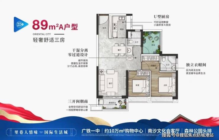 约89㎡ 2+1房两厅两卫:零过道设计,主卧带衣帽间,全南向观景阳台。