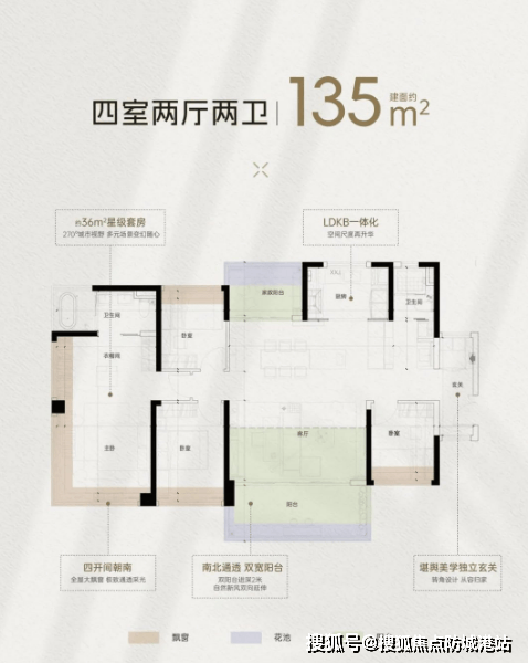 135㎡四房两厅两卫:实际使用面积约186㎡,南北双阳台设计,5.25米大宽厅连接5.45米景观阳台,主卧开间达3.6米。