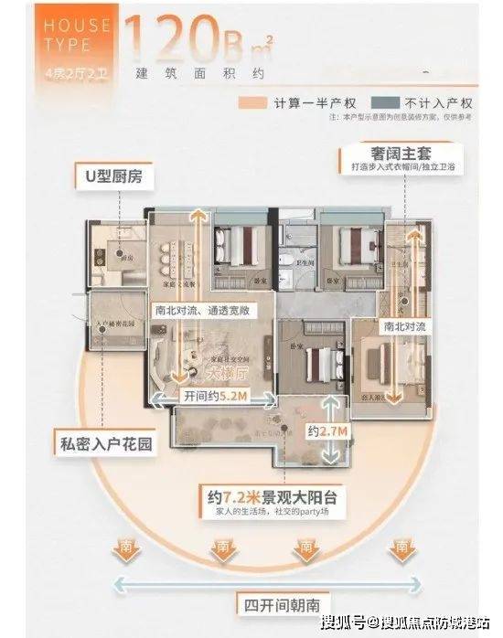建面约120㎡四房两厅两卫:A户型客厅与卧室打通后可获得大平层级别的客厅空间;B户型为横厅设计,带入户花园。
