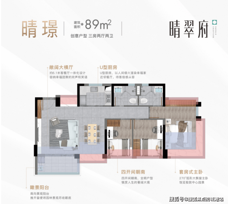 户型设计:主推89-143㎡三至四房,全南向布局,得房率超85%!