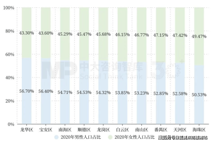 就性别结构而言,2020年,前10强区县中,男性人口均多于女性人口,其中,深圳市龙华区、深圳市宝安区男女比例差值均超过10%;相比之下,广州市海珠区最接近性别比例均衡的状态,差值仅为2.12%(见图 2)。