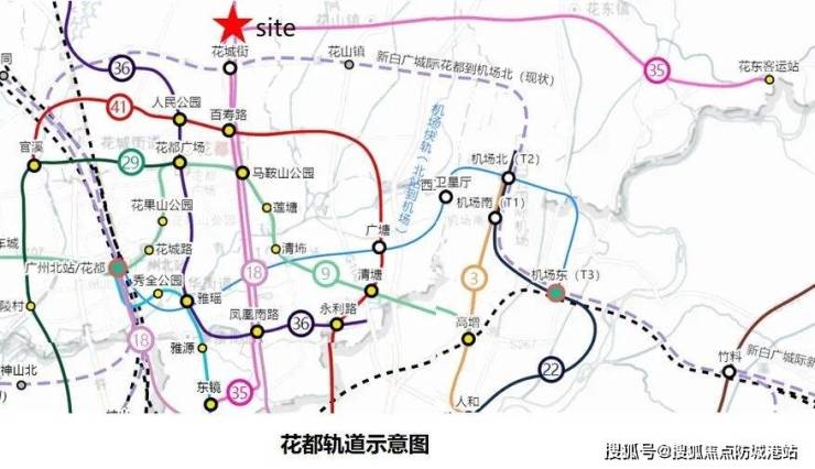 项目东南侧为花城街站,直线距离约700米,未来18号北延线、35号线以及现有在运行的东环城际都经过该站点。