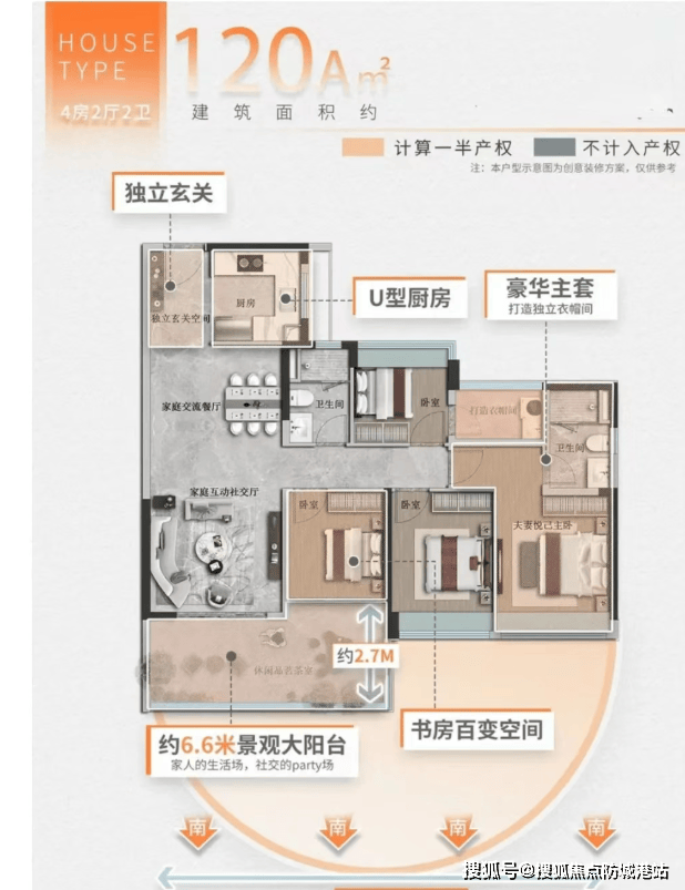 120㎡四房两厅两卫(A/B两种户型):客厅与卧室打通后可获得超大平层级别的客厅空间;B户型为横厅设计,带入户花园。