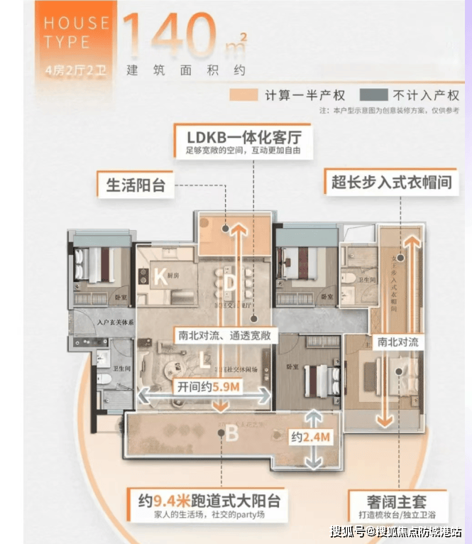 140㎡四房全景大宅:南北对流、通透宽敞,拥有约9.4米跑道式大阳台,非常适合家庭聚会等活动。