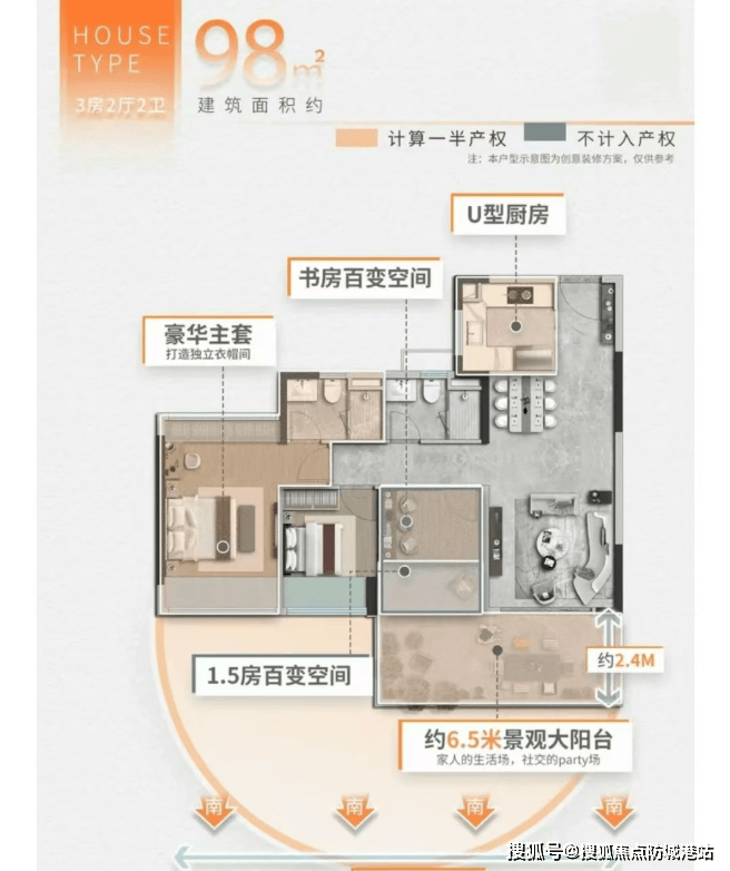 98㎡三房两厅两卫:书房改造后进深可达6米,景观大阳台延展到约6.5米。