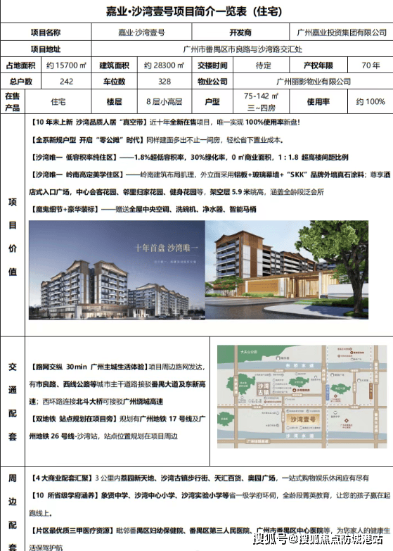 嘉业·沙湾壹号位于广州市番禺区沙湾镇,是该地区近十年来首个全新在售项目。作为汉森百盛国际设计集团的作品,该项目以其低密度、高使用率和独特的岭南美学风格吸引了众多购房者。