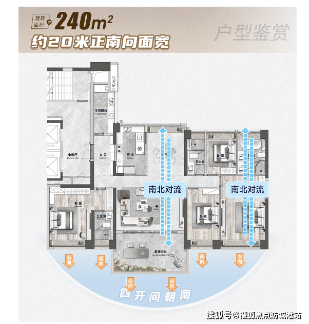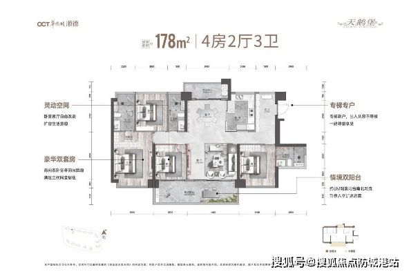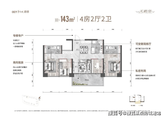 当前主推的是3座47层高的超高层建筑,包含143㎡和178㎡两种户型的四房单位,采用三梯三户设计,保证了住户的私密性和舒适度。这些户型均采用了全南向开间设计,拥有更好的采光、通风条件以及观景角度,是理想的人居选择。