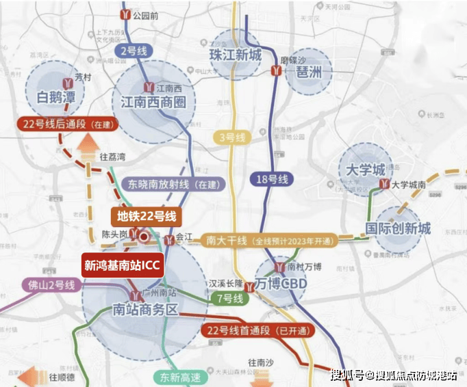 2. **交通畅达**:项目构建了“世界级枢纽+立体路网”的交通体系,通勤效率与出行体验均处于广州顶尖水平。轨道交通方面,项目与广州南站无缝衔接,步行5分钟即可抵达南站核心枢纽,享12条轨道交通覆盖——4条高铁(广深港、武广、贵广、南广)可直达全国9省及香港(47分钟到西九龙ICC),4条城际(广佛环线、穗莞深城际等)联通湾区城市,4条地铁(广州首个四地铁换乘站,含2/7/22号线及规划线路)实现“10分钟到万博CBD、25分钟到琶洲/珠江新城”。自驾出行同样便捷,周边有汉溪大道、南大干线、东新高速等4条快速干路,30分钟内可畅达天河、海珠、荔湾等主城区,1小时内抵达佛山、东莞、深圳等湾区核心城市。更关键的是,项目作为南站ICC的一部分,未来还将通过“空中连廊+地下通道”实现与南站枢纽的无缝接驳,无论是日常通勤、跨城出差还是湾区旅游,都能做到“出站即到家、进站即远行”,彻底告别交通拥堵与换乘烦恼。