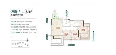 户型一:建面约82㎡三房两卫(刚需首选,四开间朝南,总价358-438万)