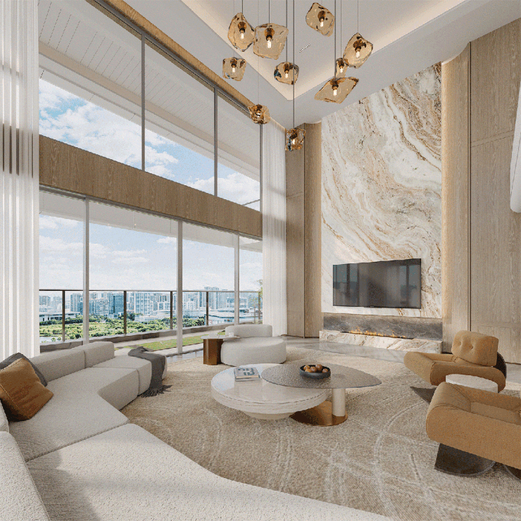 270°巨幕落地窗:超大面宽设计让自然光线充分进入室内,同时提供无遮挡的城市景观。