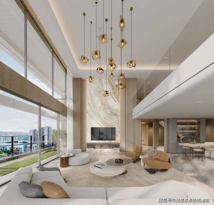 6.6米双挑空全明设计:天际会客厅不仅拥有壮观的城市视野,还融合了玺字形金色塔冠,彰显尊贵身份。