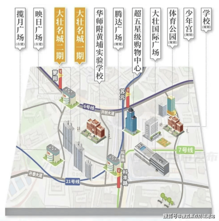 大壮名城·名门周边地铁线路形成密集网络,为湾区穿梭提供了便捷条件。项目坐拥6号线、7号线二期、21号线三地铁交汇优势,二期距离6号线暹岗站约800米,7号线科丰路站约900米,步行即可抵达;21号线苏元站约1.8公里,通过短距离接驳也能快速换乘。