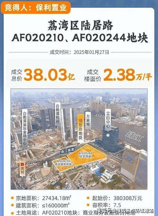 广州保利翡丽甲第位于广州市荔湾区陆居路AF020210、AF020244地块,是由保利置业广东公司开发的一个高端住宅项目。该项目于2025年1月27日以38亿成功竞得,总建筑面积达16万平方米,折合楼面价约23769元/平方米。作为保利置业在全国范围内的第三座"甲第系"作品,广州保利翡丽甲第将打造成为大湾区首座"甲第系"豪宅。