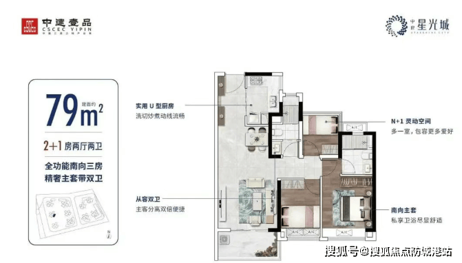 建面约79㎡南向三房,主卧套房设计:提供更高的居住舒适度。