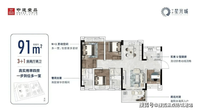 建面约91㎡南北通透四房:视野开阔,适合追求高品质生活的家庭。