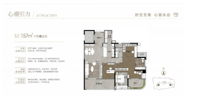 157㎡户型:四房两厅两卫,采用传统的竖厅设计,动静分区,主卧设计了270度弧形飘窗,视野采光良好。