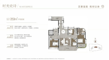 253㎡户型:四房两厅两卫,南北对流,阳台长达10米,主卧的飘窗和主卫均为270度弧形采光面,确保最佳的采光效果。