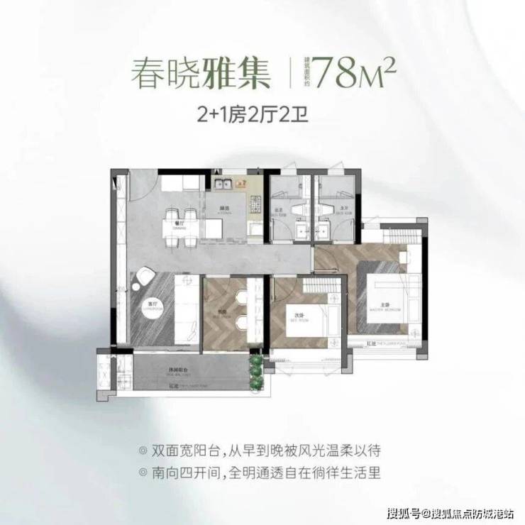 78㎡三房两卫是项目的爆款刚需户型,总价440万起,性价比拉满。该户型采用LDKG一体化设计,将客厅、餐厅、厨房、阳台打通,空间通透感十足,同时增加了家庭互动空间。四开间采光设计,让室内光线充足,告别阴暗潮湿;阳台开间达5.5米,不仅能晾晒衣物,还能打造为休闲区、养花区,满足业主的小情趣。更难得的是,78㎡户型做到了三房两卫,主卧为独立套房设计,配备独立卫生间,保证了私密性,完全能满足三口之家的居住需求,甚至未来生二胎也无需换房。