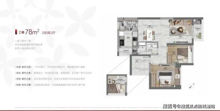 户型设计:78-140㎡三至四房,全南向户型,得房率超85%。