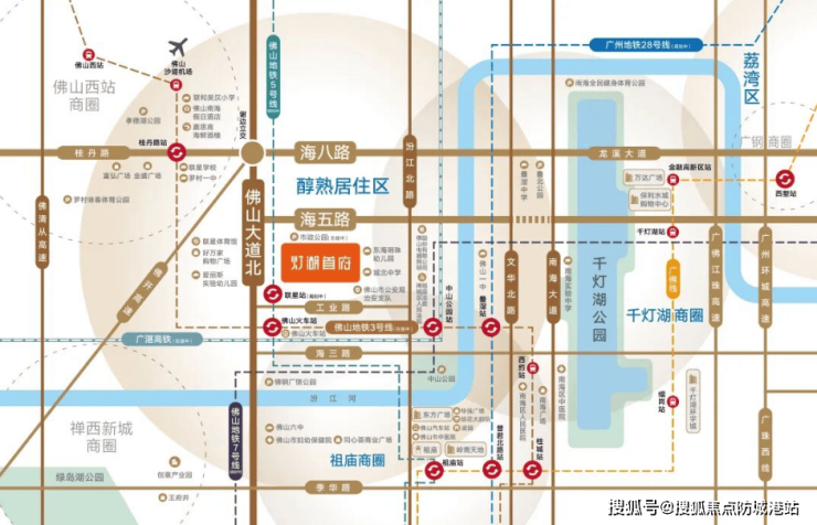 项目位于海五西路与佛山大道北交汇处,距离佛山地铁3号线(在建中)佛山火车站约1公里,未来还将有佛山5号线、7号线以及广州28号线等多条地铁线贯穿而过,交通网络十分发达。此外,项目紧邻规划中的广湛高铁佛山站,预计将成为广东首个站城一体枢纽,大大缩短了到达广州的时间,为居民提供了便捷的出行条件。
