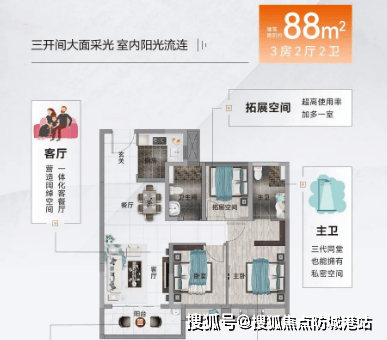 项目主力户型面积介于66-105㎡之间,所有户型均实现了半赠送多功能房的设计。特别是66㎡的“2+1”房户型,是区域内最小面积的三房产品,使用率超过九成,非常适合首次置业的家庭。客厅宽敞明亮,阳台长度可达4.1米,提供了极佳的采光效果。