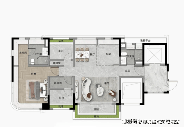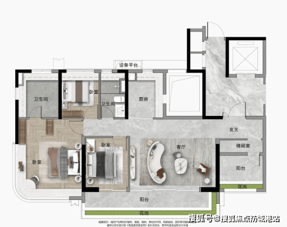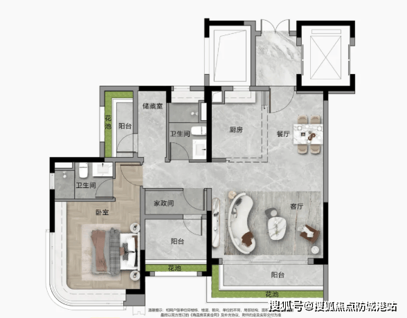建面约108-110㎡创意空间:片区罕见的小户型设计,带入户花园,最大开间大方厅达4.9米,全屋采光面约12米。