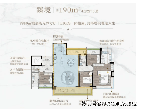 小区 6 栋住宅采用合围式设计,有 2 梯 4 户和 3 梯 3 户两种布局。目前在售 1 - 2 - 3 - 5 - 6 栋,2025 年 12 月交楼,户型为 115㎡、125㎡、143㎡、190㎡全四房产品。户型格局方正,使用率约 100%,LDKG 大方厅设计,国际品牌奢装,270° 主卧环幕观景,引领新一代豪宅典范。同时,金属玻璃幕墙及鹰嘴线脚的运用,使建筑仰视时层层递进,独具特色。